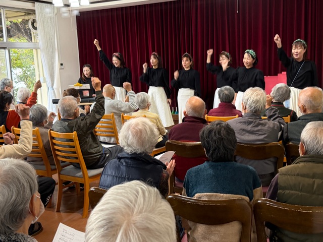 コーラスやハンドベルを使った歌を披露いただき、 入居者さんも一緒にできる手話も使った歌など、 とても楽しい時間を過ごすことができました🎵