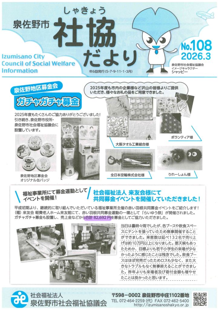 昨年12月24日に開催した「第2回らいゆう祭」の収益金を赤い羽根共同募金に寄附させていただきました。その様子が泉佐野市の社協だよりに掲載されましたのでご紹介させていただきます。